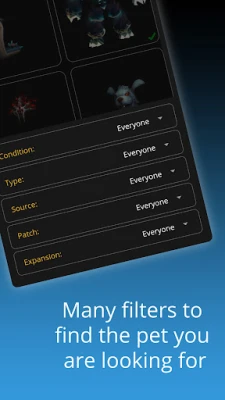 Search them by type, name, patch, expansion or source. Discover their exact location, their attacks and all the information. Add them to favorites and collect them.